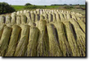 « Même si les constructions neuves sont assez rares, le travail ne manque pas car une toiture en chaume demande un entretien tous les dix à quinze ans afin de préserver ses qualités d’isolant thermique et phonique » explique Valéry Broutin qui en vante aussi la résistance aux tempêtes et bien sûr l’esthétique. À la paille de blé ou de seigle autrefois utilisée dans nos campagnes, le chaumier d’Hesdin-l’Abbé préfère nettement le roseau de Camargue pour effectuer ses travaux. Il le pose en bottes épaisses de 30 cm, longues de 1,20 m à 1,80 m, avec des outils spécifiques, fabriqués sur mesure : le chevalet (ou chaise) qui permet de se tenir à genoux sur le toit, le battoir (autrefois en bois aujourd’hui en résine) qui sert à repousser les tiges de roseau vers le faîtage, la crémaillère, les aiguilles, le couteau, le fer rond… « C’est un métier très physique pour lequel il ne faut pas être pris de vertige » assure Valéry Broutin. « Il n’y a pas beaucoup de préparation en atelier, tout se fait sur le chantier. Il faut monter les bottes de roseaux à l’épaule, le matériel, et ensuite travailler sur le toit ».