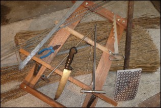 Ensuite, on ressert les tiges et on bloque avec le couteau, cette étape est nécessaire afin de dégrader le roseau avec le battoir pour avoir la quantité voulue et le recouvrement qui sert à la longévité de la chaumière.