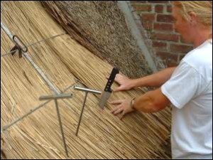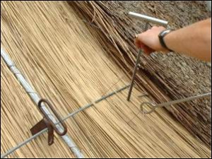 Elle sert les nœuds coulissants que le chaumier a passé tirant d’un sec le petit fil avec la main gauche et poussant avec la main droite sur le fer rond, cette opération a pour but de serrer définitivement le roseau sur la toiture.